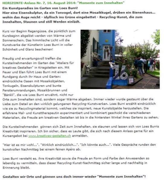 "Momente zum Innehalten" Zeitungsbericht Horizonte August 2014