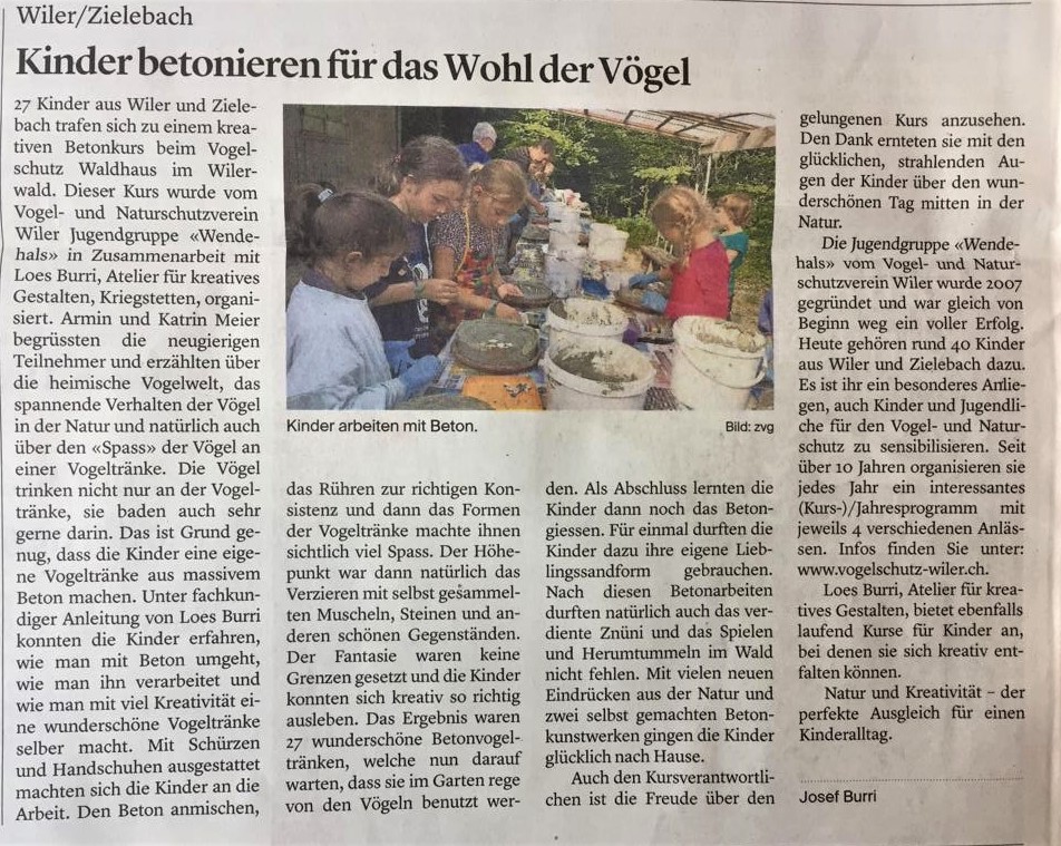 "Kinder betonieren für das Wohl der Vögel" , Solothurner Zeitung September 2019