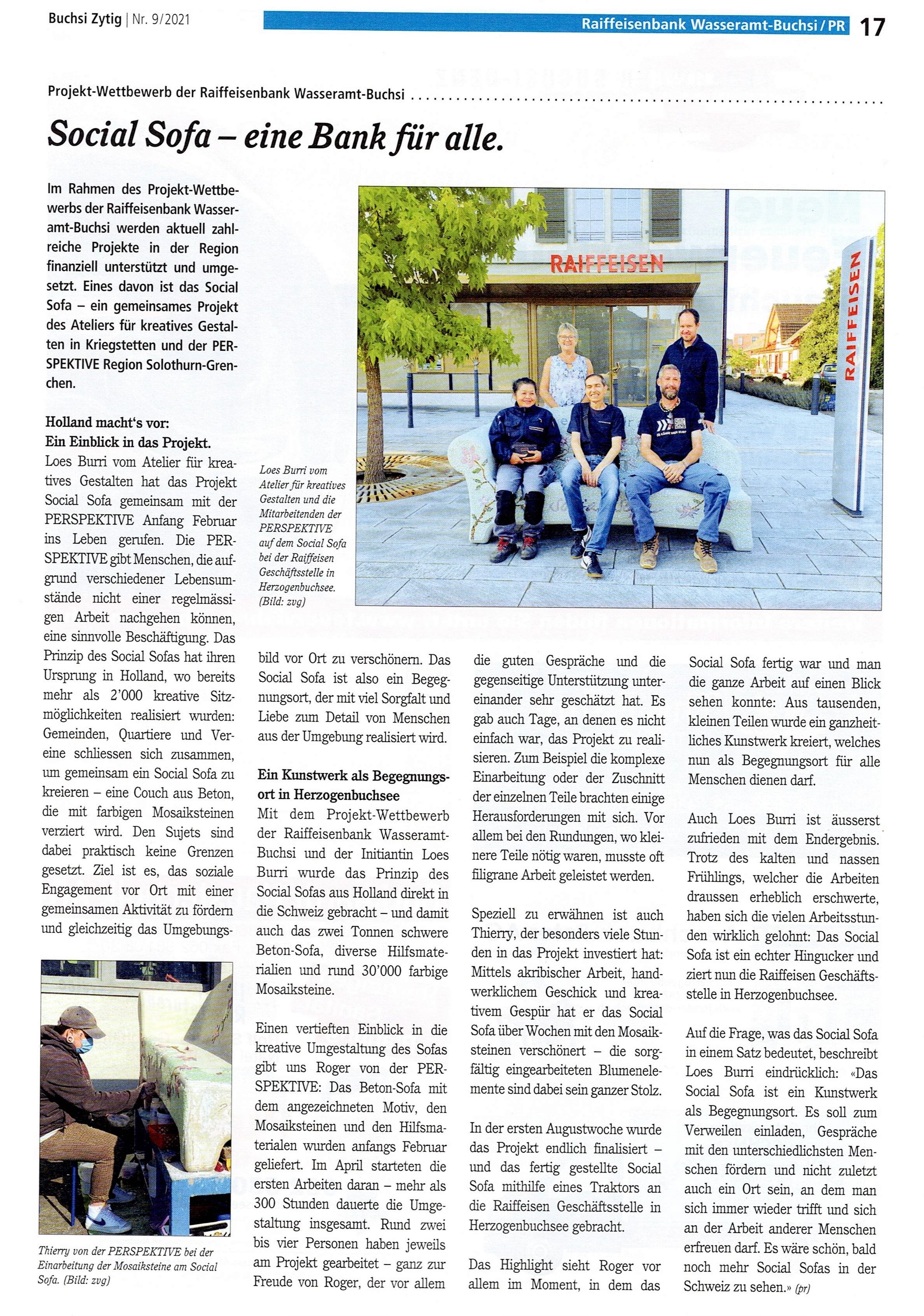 "Social Sofa - eine bank für alle" Social Sofa Raiffeisenbank Herzogenbuchsee, Buchsi Zytig 9.2021